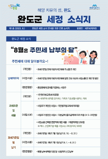‘세정 소식지’는 매달 납세자들에게 필요한 각종 지방세 정보와 세금 관련 궁금증 등을 알기 쉽게 제공하고자 완도군청 세무회계과 주관으로 제작하며, 읍면 밴드 등 SNS를 통해 전달한다.