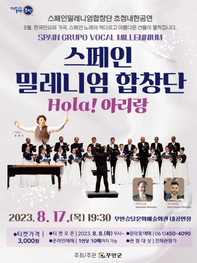 김산 무안군수는 “수준 높은 합창단의 전통 스페인 음악과 외국인이 부르는 우리 노래를 통해 우리 민족 고유의 정서를 외국인의 선율로 느낄 수 있는 감동의 무대를 만나게 될 것”이라고 기대했다.