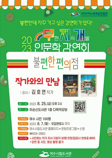 이번 행사는 시민의 인문학 역량 강화에 기여코자 마련된 ‘무한지식개발’ 인문학 강연회의 일환으로 지난 6월 독립출판을 주제로 강연한 공가희 작가에 이은 두 번 째 강의다.