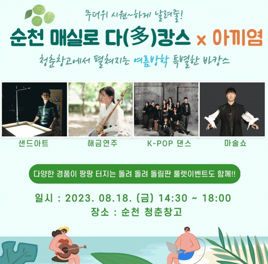 또한 청춘창고 1층 푸드코트에서 8,000원 이상 구매하거나 아끼염에서 순천매실맛젤라또를 구매하면 증정되는 응모권을 통해 텀블러?선풍기?돗자리 등 순천매실굿즈와 청춘창고 2층 매장 이용권을 받을 수 있는 경품이벤트에 참여할 수 있다.