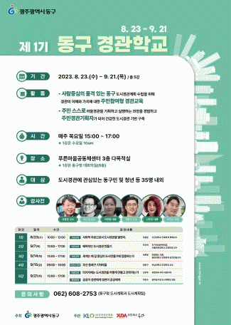 1회차 교육은 오는 23일 조용준 조선대 건축학과 명예교수를 초청해 ‘사회적 자본으로서 도시경관을 말한다’를 주제로 공개강좌 형식으로 진행된다. 도시경관에 대해 관심있는 동구민은 누구나 참여할 수 있다.
