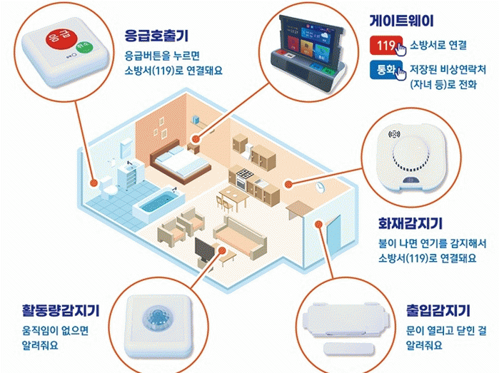 응급호출기, 게이트웨이, 화재·활동량·출입 감지기로 구성된 장비는, 가정에 화재가 발생하면 119에 자동 신고하도록 설계됐다.
