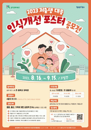 특히 올해 공모는 주민 참여율을 높이기 위해 북구 관내 초.중학교 재학생을 대상으로 가족에 대한 긍정적 이미지를 제고하는 내용의 저출생 대응 인식개선 포스터 분야에 아이디어를 집중 모집한다.