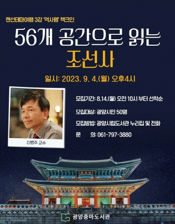 이번 강연에서는 신병주 교수의 책'56개 공간으로 읽는 조선사'를 주제로 공간을 통한 역사와 문화를 알아보는 시간을 갖는다.
