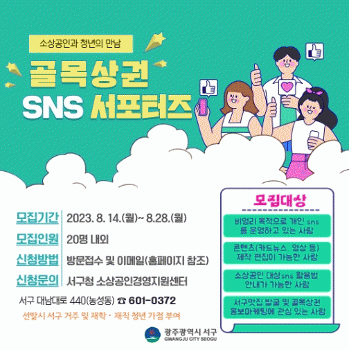 서구는 오는 28일까지 대학생 및 청년 20명을 모집, 이들을 ‘제1기 골목상권 SNS서포터즈’로 임명해 서구 관내 골목상권 및 소상공인들의 제품과 서비스를 SNS로 홍보하며 상권 활성화에 힘을 보탤 계획이다. 활동은 ▲농성1?2동, 광천동, 풍암동 ▲양동, 양3동, 상무1·2동 ▲화정 1·2·3·4동 ▲서창동, 금호1·2동 ▲유덕동, 치평동, 동청동 등 권역별로 팀을 나누어 홍보 아이템 발굴 및 상인단체 온라인 네트워크 구축 등을 진행한다.