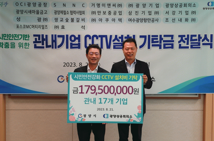 이백구 광양상공회의소 회장을 비롯한 기업대표들은 “기탁금으로 CCTV가 필요한 곳에 많이 설치돼 시민의 안전과 지역사회발전에 기여되기를 기대한다”고 전했다.