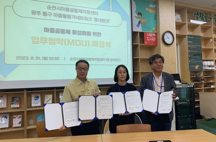 박병두 순천시마을공동체지원센터장은 “이번 협약은 지속 가능한 마을공동체 구축을 위해 3개 기관이 함께 협력하는 첫걸음”이라며, “지역의 경계를 넘어 인적 자원을 지원하고 공유하여 공동체 활동이 지역사회를 위한 시너지 효과를 낼 수 있도록 함께 노력하자”라고 말했다.