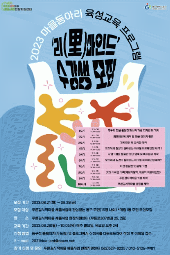 이번 교육은 이달 29일부터 10월 5일까지 매주 월·목요일에 푸른길 시작마을 새뜰사업 현장지원센터에서 진행된다. 이 기간 동안 패브릭 소품 가방 만들기와 아크릴 피포 페인팅(유화 그리기) 상품 제작 등 총 10회 차로 운영될 예정이다.