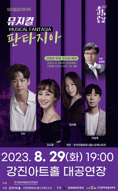 공연은 코리안필하모니팝스오케스트라의 웅장하고 장엄한 서곡으로 ‘레미제라블’, ‘캣츠’, ‘지킬&하이드’, ‘맨 오브 라만차’ 등 한국인이 가장 사랑하는 뮤지컬 넘버 중 예술성과 대중성을 모두 갖춘 레퍼토리를 엄선해 국내 최정상 뮤지컬 배우 카이, 김소향, 김사랑, 이승욱이 작품 속 뮤지컬 배우의 생생한 목소리로 평생 잊지 못할 최고의 감동을 선사한다.