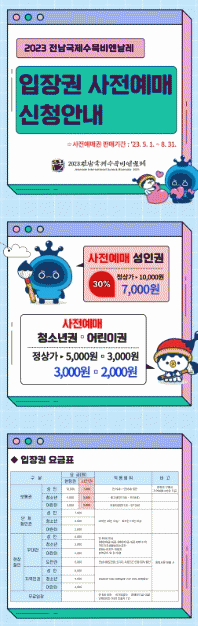 사전예매 입장권은 전남국제수묵비엔날레사무국 누리집, 티켓링크, 네이버를 통해 구매할 수 있다. 성인권은 현장 구매가(1만 원)에서 30% 할인된 7천 원, 청소년은 3천 원, 어린이는 2천 원이다.