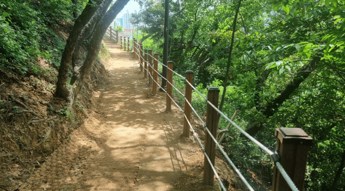 시는 사업비 1억원을 투입해 지난 4월부터 노후시설물 개선공사를 추진했으며, 보행환경 개선을 위해 야자 매트 교체 및 탄성포장과 데크 계단, 난간 등 둘레길 230m 구간을 정비했다.