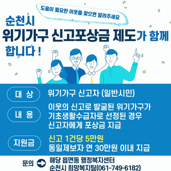 순천시 관계자는 “복지사각지대 발굴 신고 포상금 제도가 이웃에게 더 많은 관심을 기울이는 계기가 되길 바라며, 촘촘한 복지안전망을 마련하여 복지사각지대 해소에 최선을 다하겠다”고 말했다.