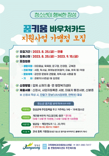 청소년 수당 도입을 앞둔 장성군은 25일부터 9월 15일까지 ‘청소년 꿈키움 바우처카드’ 가맹점을 모집한다. 대상은 청소년의 생활 지원, 진로 개발, 문화?체육 활동 등에 적합한 업체다.