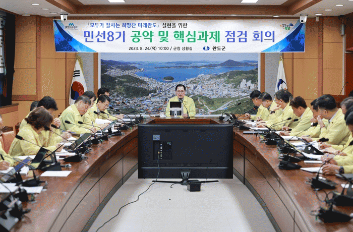 신우철 군수는 “민선 8기는 완도 발전의 전환점이 될 중요한 시기로 일자리와 소득 창출에 막대한 영향을 미치는 해양치유산업과 바이오산업, 의료, 관광, 농수축산업의 연계를 통해 한 단계 더 도약할 수 있어야 한다”고 강조하면서 “공약은 군민과의 약속인 만큼 그 효과를 군민들이 체감할 수 있도록 책임감을 갖고 착실하게 추진해 나가자”라고 당부했다.