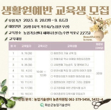 교육 신청은 화순군민, 농업인 우선으로 신청(별도 서류 확인)하며 8월 28일부터 방문 및 전화 접수하면 된다.