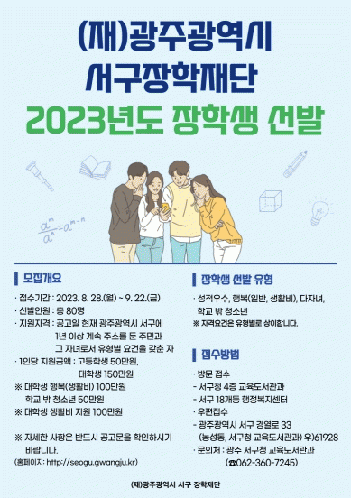 장학금 지원을 희망하는 주민은 서구청 홈페이지에 게시된 공고문을 참고해 9월 22일까지 서구청 교육도서관과 또는 서구 관내 동 행정복지센터, 우편 등을 통해 접수하면 된다. 최종 선발은 장학재단 사무국 심의 후 11월중 개별 통보 할 예정이다.
