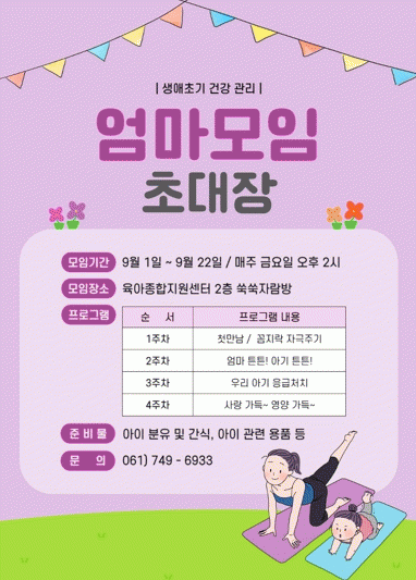 모임은 순천시 육아종합지원센터에서 주 1회(금요일) 4회기 동안 운영되며, 프로그램은 ▲1일 서로 알아가기, 아기장난감 만들기 ▲8일 베이비 마사지&산후요가 ▲15일 아기 안전 교육 ▲22일 유아식 영양교육의 내용으로 구성된다.