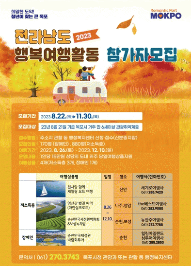 목포시 관계자는 “앞서 진행된 여행 참가자들이 높은 만족감을 보였으며, 2차 행복여행 참가자도 부담 없이 여행을 즐길 수 있는 기회가 될 것으로 기대한다”면서 참여를 적극 권장했다.