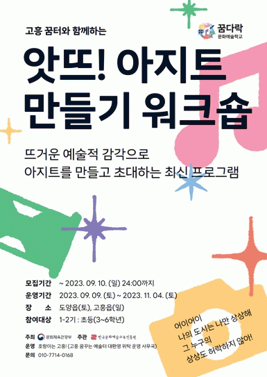 또한, 어린이들의 예술 아지트를 만들고 도시를 어린이 건축가의 시각으로 함께 상상해보는 건축 교육프로그램 ‘앗뜨! (art) 아지트 만들기 워크숍’도 9월 9일 개강을 앞두고 있다. 기수별로 20명씩 총 40명을 모집하는 본 건축 교육 프로그램은 꿈터의 소재지인 고흥읍 뿐만 아니라 도양읍에서도 진행될 예정이다.