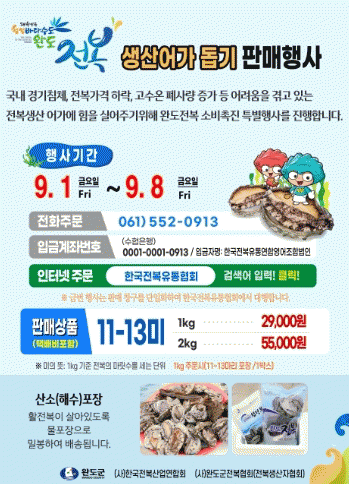 9월 1일부터 8일까지는 다른 크기의 전복에 비해 적체되어 있는 전복 11미~13미를 판매하기 위해 '전복 생산 어가 돕기 판촉전'을 추진한다.