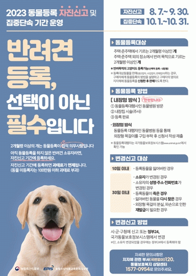 동물등록을 하지 않았거나 변경된 정보를 신고하지 않은 경우도 이번 기간에 신고하면 과태료 부과가 면제된다.