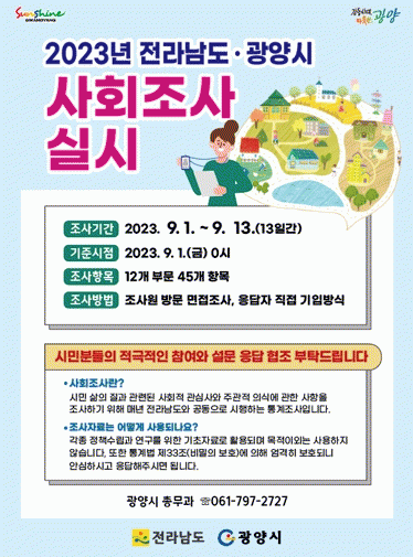 장민석 총무과장은 “사회조사 결과가 지역의 균형적 발전과 정책 등을 입안하는데 중요한 자료로 활용될 수 있도록 조사 대상 가구의 적극적 협조와 참여를 부탁드린다”면서 “조사된 내용은 통계법으로 철저히 보호되고, 통계 목적 외는 절대 사용되지 않으니 안심하고 성실히 조사에 응해 주시길 당부드린다”고 말했다.