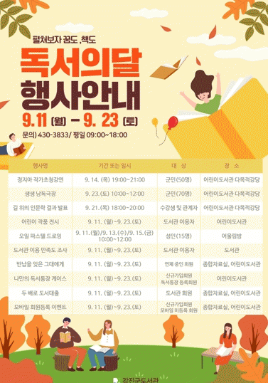 이와 함께 연체회원을 위한 ‘반납을 잊은 그대에게’, ‘나만의 독서통장 케이스’, ‘두 배로 도서대출’, ‘모바일 회원카드 등록 이벤트’ 등 다채롭고 풍성한 행사들이 준비돼 있다.