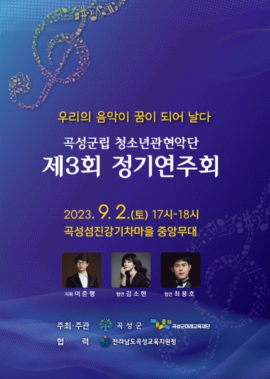 곡성군립청소년관현악단 단원은 “멋진 연주를 위해 열심히 준비했다. 많은 분들이 오셔서 함께 즐겨주시길 바란다.”라고 공연을 앞두고 소감을 전했다.
