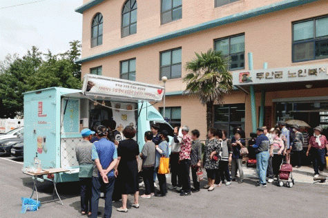 경로식당에서 식사를 마치신 어르신 200여 분께 도담갈비 대표를 비롯한 직원 9명이 직접 커피와 아이스티 등 시원한 음료를 나눠드렸고, 어르신들께 잠시나마 무더운 여름을 잊으실 수 있는 시간을 제공해 큰 호응을 얻었다.