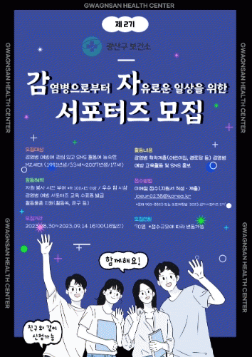 모집 기간은 30일부터 9월14일까지다. 광산구 누리집(뉴스?소식→공고→고시/공고/입법→광산구 감염병 예방 서포터즈) 또는 광산구 공식 블로그, ‘감자 블로그’에 게시된 인터넷 창구를 통해 지원할 수 있다.