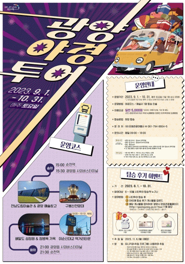야경코스는 순천역(15시), 광양읍 버스터미널(15시 30분)에서 탑승해 전남도립미술관과 광양예술창고, 구봉산전망대 투어 후 이순신대교 먹거리타운에서 저녁을 즐긴다.