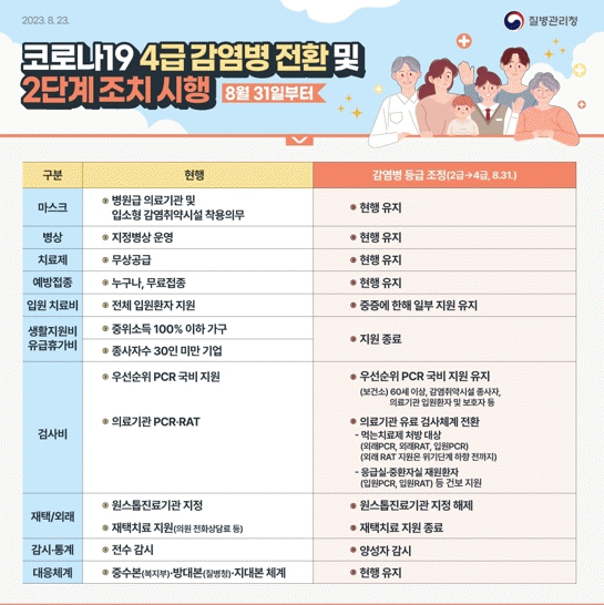 병원급 의료기관과 입소형 감염 취약 시설 내 실내 마스크 착용과 확진자 격리 권고는 유지된다. 먹는 치료제 처방 대상군, 응급실, 중환자실 등 고위험군에 대해 검사비 일부 지원도 지속된다.