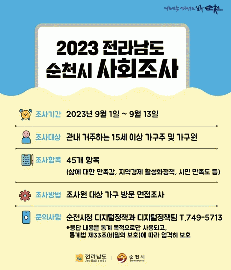 순천시 디지털정책과 관계자는 “사회조사로 수집된 자료는 통계법 제33조(비밀의 보호)에 따라 통계작성 목적 이외에는 사용되지 않는다”며, “순천시민의 삶의 질을 높이고 살기 좋은 도시를 만들기 위한 이번 조사에 대상 가구의 적극적인 협조를 부탁드린다”라고 말했다.