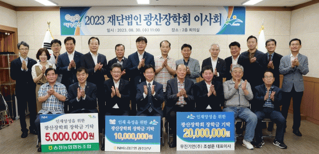[뉴스맘]재단법인 광산장학회가 30일 오전 광산구청 2층 상황실에서 2023년 제2차 이사회를 개최한 가운데, 회의에 앞서 지역 인재 육성을 위한 장학금 전달식이 열렸다. 전달식에서 NH농협은행 광주본부는 1000만 원, 무진기연(주)는 2000만 원, 송정농업협동조합은 500만 원을 각각 기탁했다.