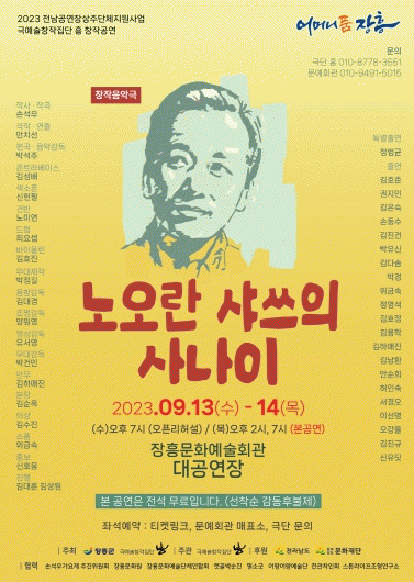 2023통합의학박람회 부대행사로 열리는 이번 공연은 장흥문예회관에 상주하고 있는 극예술창작집단 흥의 창작공연으로 군민오디션을 거쳐 선발한 장흥의 끼 많은 배우들과 선생의 음악을 사랑하는 뮤지션들이 함께한다.