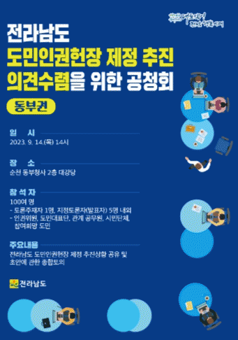 공청회에는 인권전문가, 도민 대표단, 시민단체, 각계각층의 도민이 참여하는 토론의 장으로 운영되며, 인권헌장 제정 추진상황을 공유하고 초안에 대한 전문가 의견발표, 현장 질의응답 순으로 진행될 예정이다.