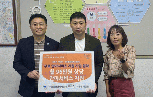 이날 협약에 따라 해든손 지압원은 수완동 관내 거주하고 있는 수급, 차상위 대상 여성 어르신 8명에게 월 2회 총 96만 원 상당의 안마서비스를 제공할 예정이다.