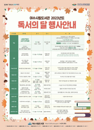 여수시는 9월 독서의 달에 도서관 방문 및 독서 증진을 위한 다양한 문화행사를 개최해 긍정적인 독서활동 체험과 도서관 이용 증대에 기여한다는 방침이다.