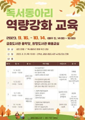 이번 역량 강화 교육은 ‘독서동아리의 이해와 실제 사례’와 ‘그림책 깊이 읽기와 독후활동’이라는 주제로 오는 9월 16일부터 10월 14일까지 매주 토요일 오후 2시부터 주제별 각 2회씩 네 차례에 걸쳐 운영된다.