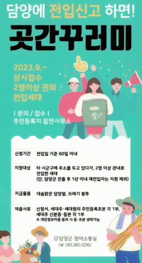 전입세대 곳간꾸러미 지원사업은 타 시군구에 1년 이상 연속해 거주하다가 담양군으로 전입한 2명 이상으로 구성된 세대에게 따뜻한 환영의 인사를 전하기 위해 기획했다.