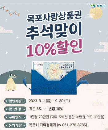 이번 목포사랑상품권 할인율 상향은 명절인 추석을 맞아 물가상승 등으로 위축된 지역 내 소비를 촉진하고 지역경제에 활력을 불어넣기 위해 추진하게 됐다.