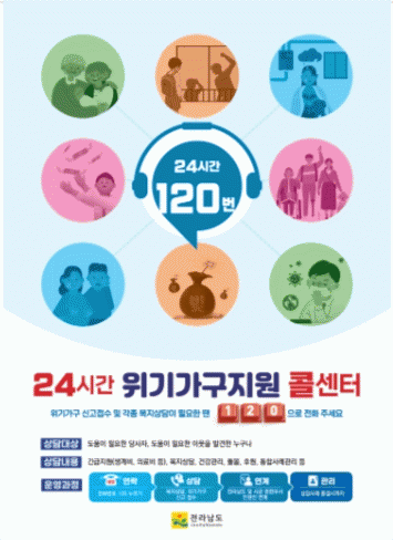 전남도는 복지 사각지대에 놓인 도민을 발굴하고 지원하기 위해 지난해 9월부터 ‘24시간 위기가구지원 콜센터(120번)’도 운영하고 있다.