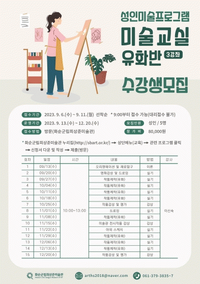 ‘미술 교실 유화반’ 수강 신청 기간은 9월 6일부터 9월 11일까지이며, 모집인원은 5명이다. 미술에 관심 있는 관내 주민(만 20세 이상 성인)은 누구나 신청할 수 있다. 수강료는 8만 원이다.