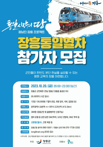 탑승객 모집은 이달 중 온라인 모집으로 진행되며, 장흥군청 누리집 또는 통일열차 홈페이지를 통해 가능하다.