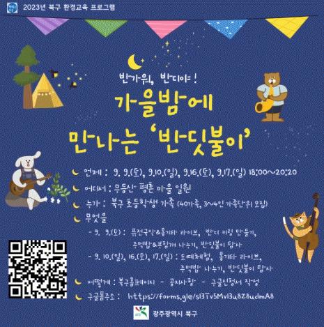 북구는 먼저 오는 9일부터 17일까지 회당 50여 명의 가족 단위 주민을 대상으로 ‘가을밤에 만나는 반딧불이 행사’를 4회 운영하여 통기타 공연, 환경 퀴즈 풀이, 반딧불이 탐사 등 주민들이 즐길 수 있는 다채로운 프로그램을 제공할 계획이다.