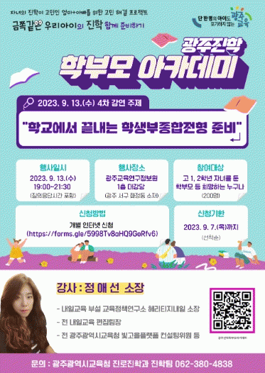 앞으로 ‘광주진학 학부모 아카데미 특강’은 시기에 적합한 주제로 진행된다. 이어지는 강의는 ▲학생부교과전형을 위한 대학 어디가 활용법(10월) ▲학생부종합전형을 위한 과목 선택과 대학의 평가(12월) 순서로 운영할 계획이다.
