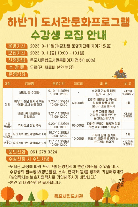 수강 신청은 오는 10일까지 목포시통합도서관 누리집에서 가능하며 모든 강좌는 무료(단, 교재비 및 재료비 본인 부담)이다.