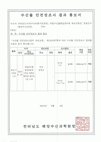 이번 안전성 검사는 방사성 물질인 요오드, 세슘에 대해 기준치 이상 검출 여부에 중점을 두었으며 수거한 시료를 해양수산과학원(목포지원)에 보내 정밀 검사하는 방식으로 진행했다. 검사 결과‘적합’판정을 받았으며 현재까지 수산물에 대한 방사능 유해물질이 적발된 사례는 단 한 건도 없었다.