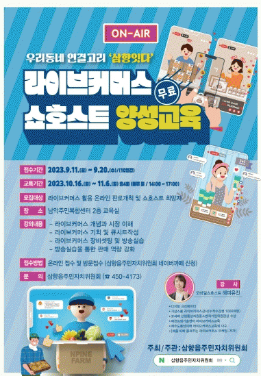 고성운 삼향읍주민자치위원장은 “삼향잇다 실시간 소통판매 방송판매자 교육을 통해 교육생들이 온라인 역량강화 및 매출증대로 우리지역내 지역상권이 활성화되길 바란다”고 전했다.