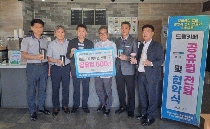 플라스틱 제로 광양 운동본부와 광양장애인복지관은 7일 시청 내 드림카페에서 ‘1회용 컵 없는 청사 만들기를 위한 드림카페 공유컵 전달 및 협약식’을 가졌다.